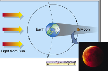 | Figure 1.17 Lunar Eclipse A lunar eclipse occurs when the Moon passes through Earths shadow. At these times we see a darkened, copper-colored Moon, as shown in the inset photograph. The red coloration is caused by sunlight being reddened and deflected by Earths atmosphere onto the Moons surface. An observer on the Moon would see Earth surrounded by a bright but narrow ring of orange sunlight. Note that this figure is not drawn to scale, and only Earths umbra (see text and Figure 1.19) is shown. (Inset: G. Schneider) |