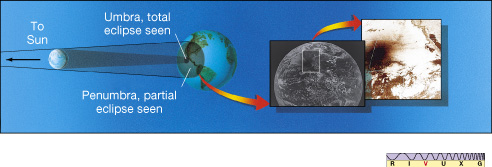 | Figure 1.19 Lunar Shadow Photograph taken by an Earth-orbiting weather satellite of the Moons shadow projected onto Earths surface (off the coast of Baja California) during the total solar eclipse of July 11, 1991. (Inset: NOAA) |