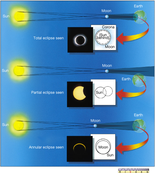 | Figure 1.20 Solar Eclipse Types The Moons shadow on Earth during a solar eclipse consists of the umbra, where the eclipse is total, and the penumbra, where the Sun is only partially obscured. If the Moon is too far from Earth at the moment of the eclipse, there is no region of totality; instead, an annular eclipse is seen. (Inset: G. Schneider) |
