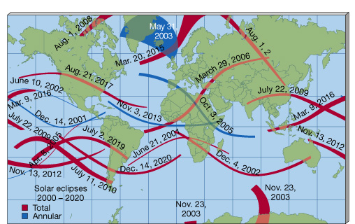| Figure 1.22 Eclipse Tracks Regions of Earth that will see total or annular solar eclipses between the years 2000 and 2020. Each track represents the path of the Moons umbra across Earths surface during an eclipse. The width of the track depends upon latitude on Earth and upon the distance from Earth to the Moon during the eclipse. High-latitude tracks are broader because sunlight strikes Earths surface at an oblique angle near the poles (and also because of the projection of the map). The closer the Moon is to Earth during a total eclipse, the wider the umbra (see Figure 1.19). |