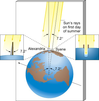 | In about 200 B.C. a Greek philosopher named Eratosthenes (276194 B.C.) used simple geometric reasoning to calculate the size of our planet. He knew that at noon on the first day of summer, observers in the city of Syene (now called Aswan), in Egypt, saw the Sun pass directly overhead. This was evident from the fact that vertical objects cast no shadows and sunlight reached to the very bottoms of deep wells, as shown in the insets in the accompanying figure. However, at noon of the same day in Alexandria, a city 5000 stadia to the north, the Sun was seen to be displaced slightly from the vertical. (The stadium was a Greek unit of length, roughly equal to 0.16 kmthe modern town of Aswan lies about 780 km south of Alexandria.) Using the simple technique of measuring the length of the shadow of a vertical stick and applying elementary trigonometry, Eratosthenes determined the angular displacement of the Sun from the vertical at Alexandria to be 7.2°.
