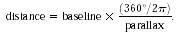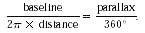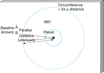 To compute the planets distance, we note that the ratio of the baseline AB to the circumference of the large circle shown in the figure must be equal to the ratio of the parallax to one full revolution, 360°. Since the radius of the large circle is 2 times the distance to the planet (where the Greek letter "pi"is approximately equal to 3.142), it follows that